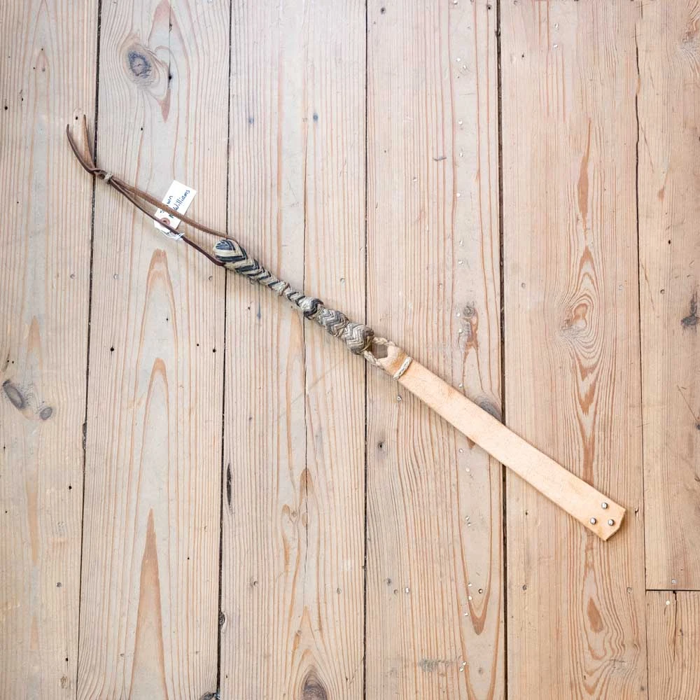 26″ Braided rawhide quirt in black and natural rawhide. Flat leather popper with metal “Stingers”.