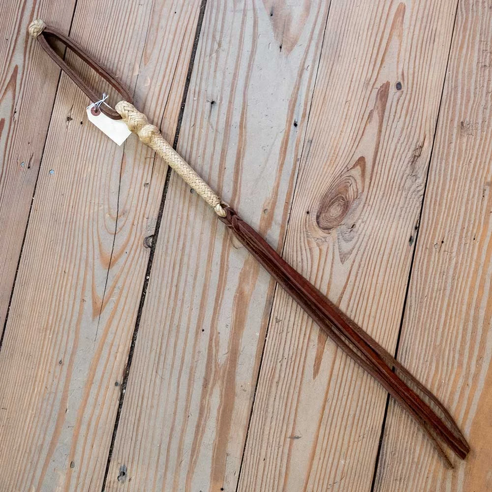 27″ braided rawhide quirt with knot details, sturdy wrist strap and multiple leather poppers.