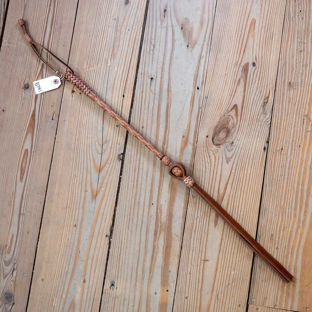 31″ Braided rawhide quirt handmade by Rhetley Berrett with wrist strap and leather popper.
