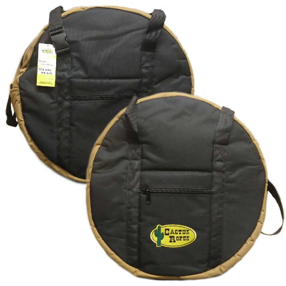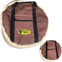 Our Triple Rope Bag can carry up to nine ropes. It is heavily padded and has a burlap lining on the inside. The outside is assembled with a durable polyester material and it has accessory pockets on both sides. It measures approximately 20” tall X 20” wide X 11” deep.