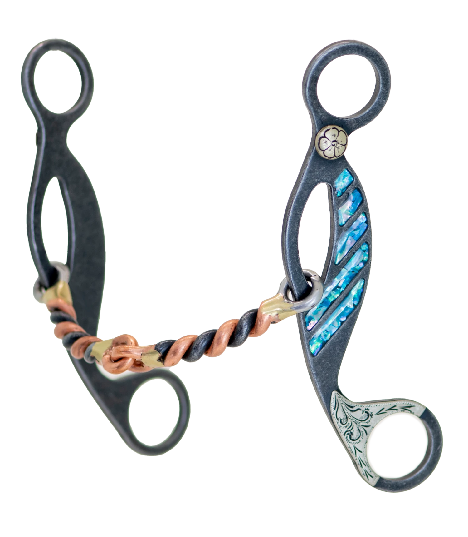 The Cowboy Tack Turquoise Snaffle Copper Twist Gag Bit is a Level 3 bit with superior craftsmanship. Built with a 5-1/8″ sweet iron curved snaffle mouthpiece and 7″ shanks with turquoise inserts and stainless steel trims, this dark grey steel bit has been crafted to provide superior comfort and control.