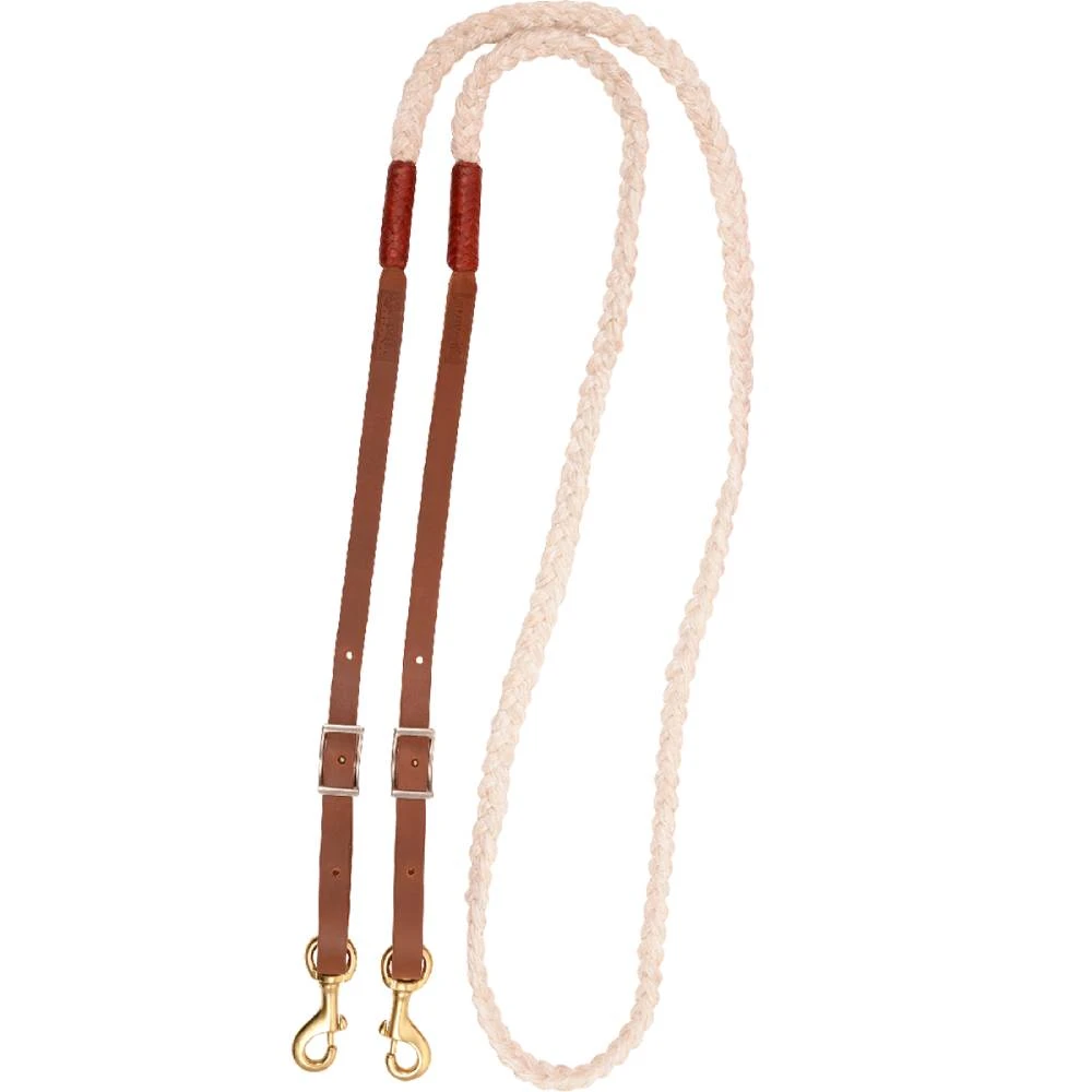 5/8″ Hand braided nylon roping reins with leather ends and snaps.