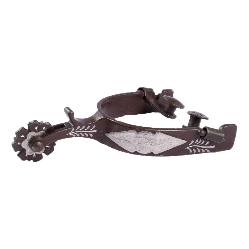 These brown antique ladies spurs feature stainless steel engraving on the shank and trim. A stainless steel floral design is molded onto the band for a more show ready look. The level three rowels also feature a stainless steel engraved trim to complete this spurs show ready look.