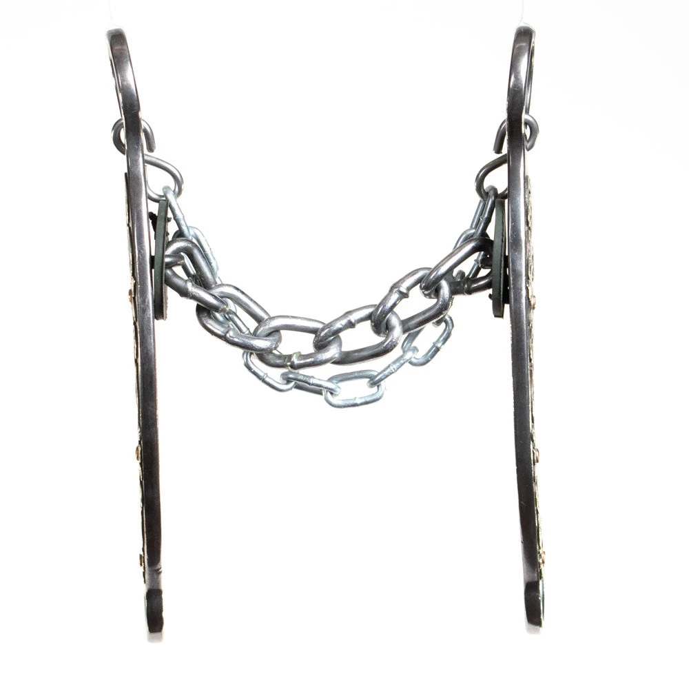 Patrick Smith bit with a chain mouth, mounted scrollwork on the 8″ cheeks and chain curb.