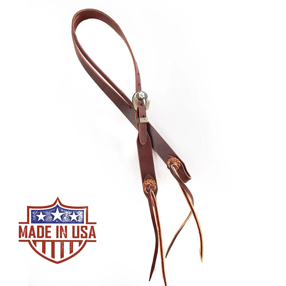 Patrick Smith collection split ear high quality heavy latigo leather headstall. Accented with a flower buckle and pineapple knot ties.