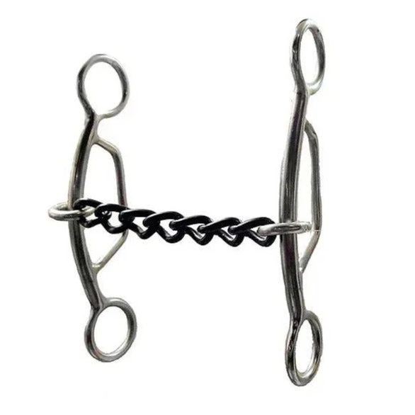 Short shanked chain sliding gag bit. Provides gradual flex, reate and collection giving ponies the opportuniity to react before hitting the end of the gag. Sweet iron mouthpiece comes in 4″ and 4.5″.