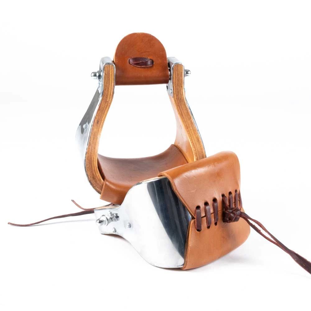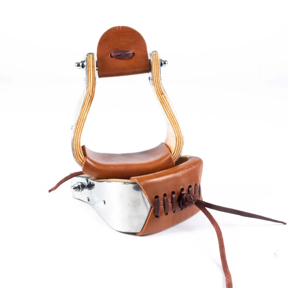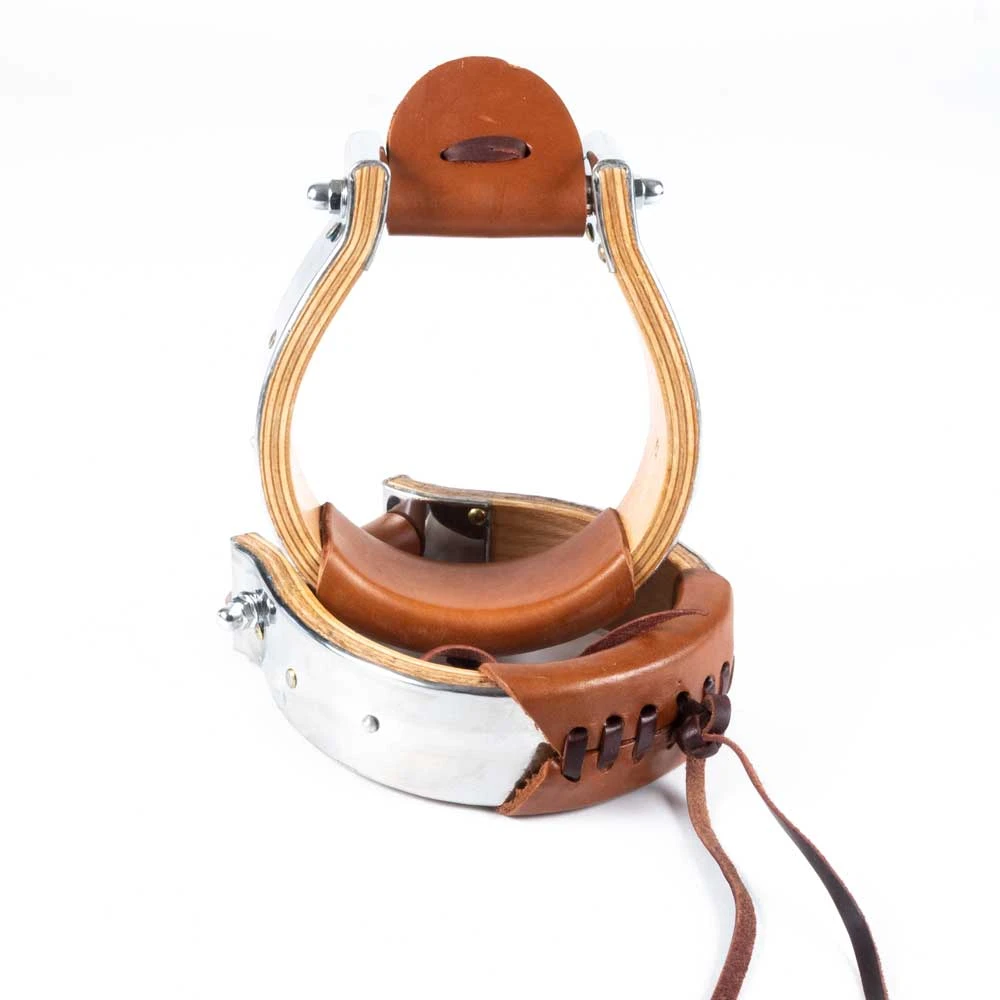 Comfortable wood bell-bottom or oxbow stirrups bound in stainless Monel with generous leather tread and tied with pineapple knots.Â