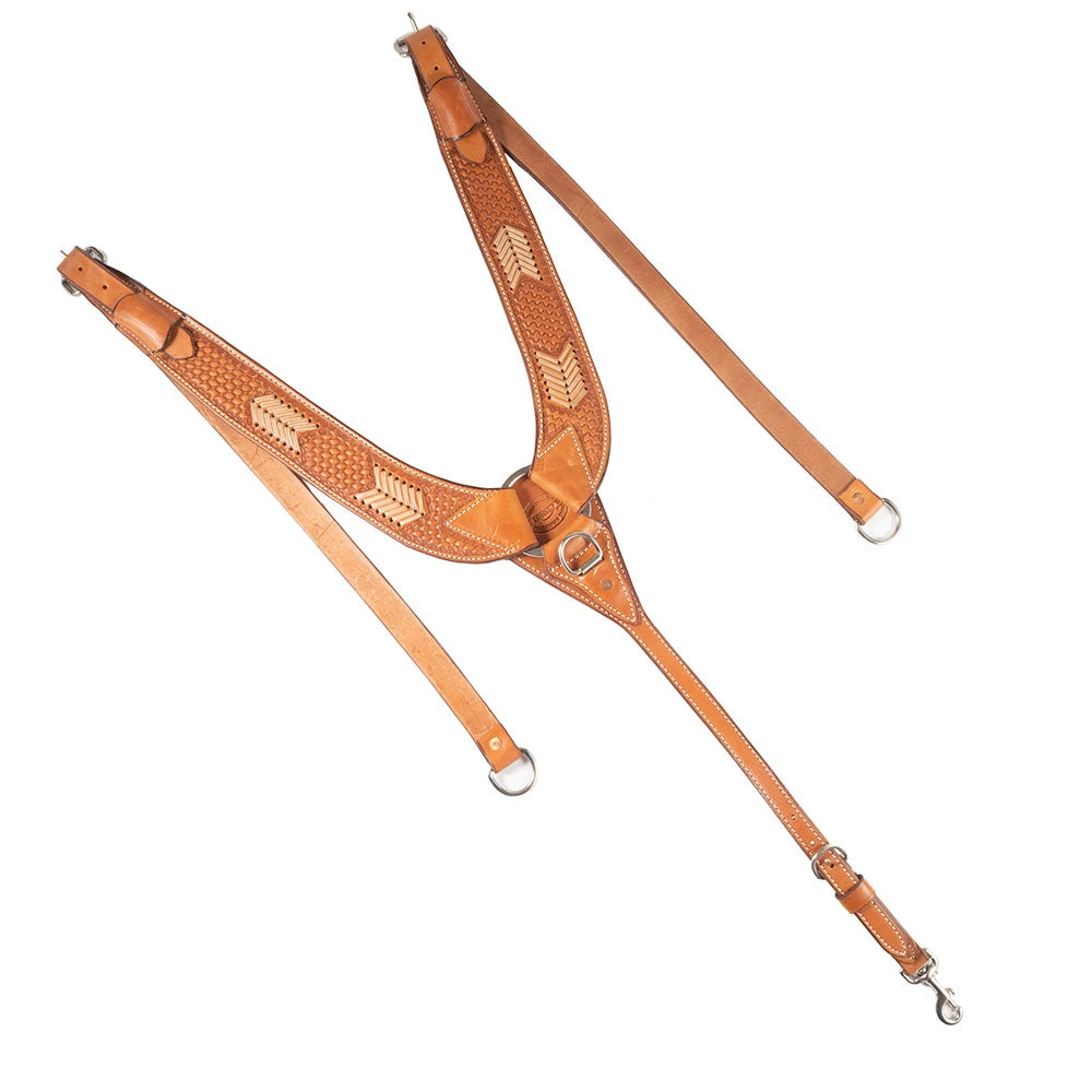 Teskey’s Basket Stamped Pulling Collar with beautiful rawhide arrows and stainless steel hardware. Tapers from 3″ to 2″ wide. Available in Light Oil or Heavy Oil.