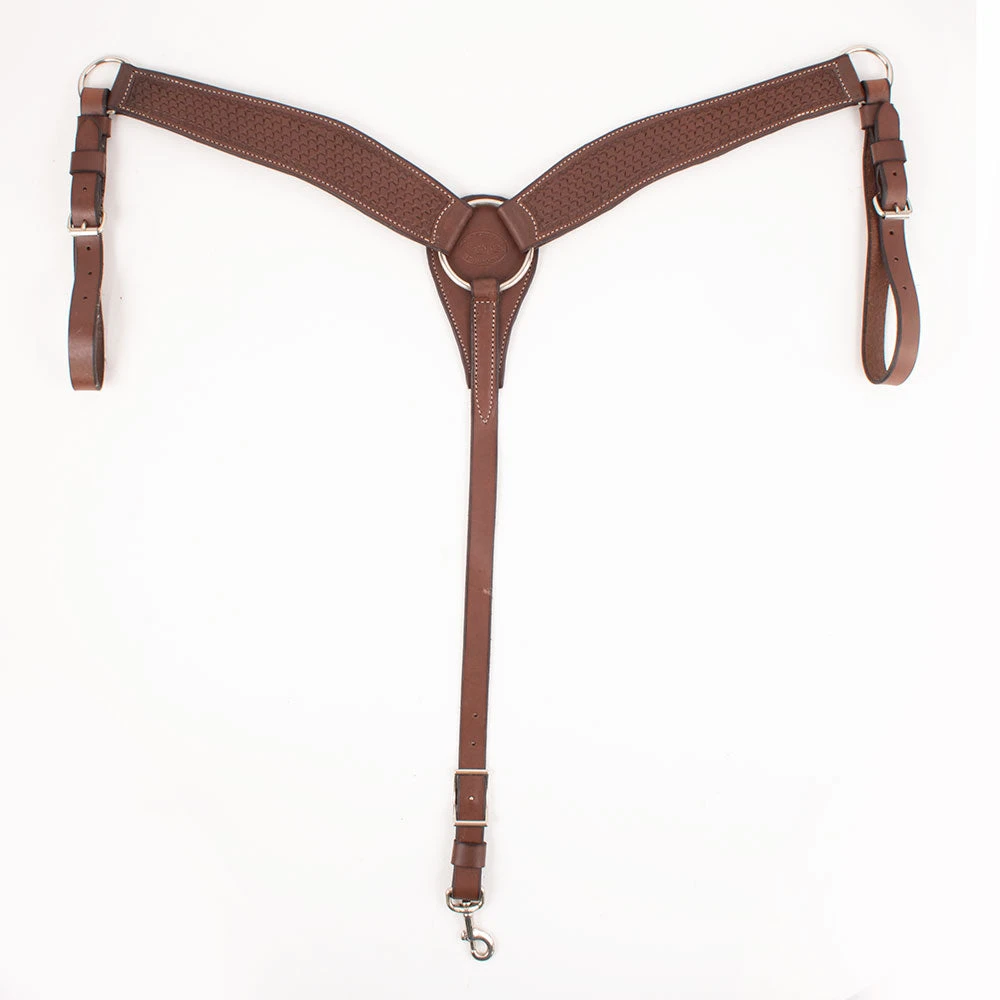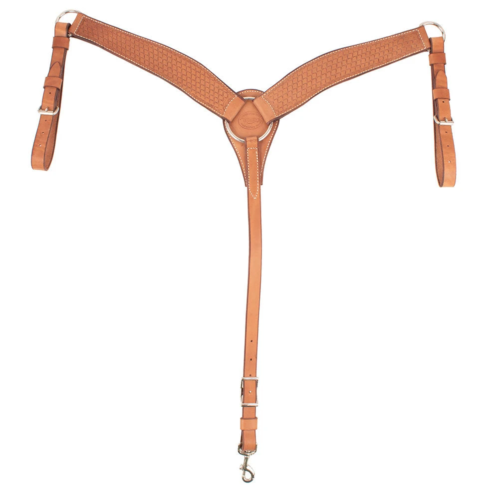 2.5″ wide leather breast collar with basketweave tooling and stainless hardware. Made in Mexico for Teskey’s Saddle Shop.