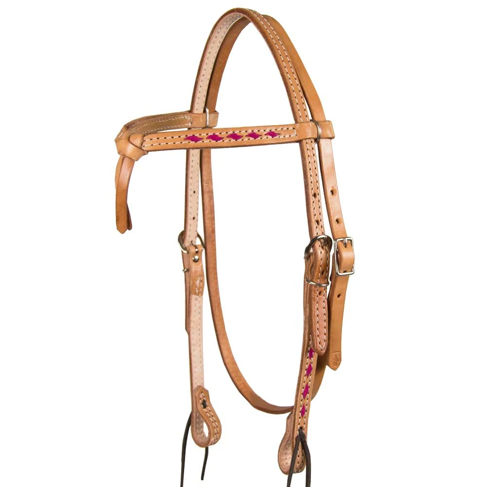 Teskey’s browband headstall features your choice of colored buckstitch. Includes suede buckstitch, double ply leather, double white stitching, crossover browband design, and leather tie bit ends.