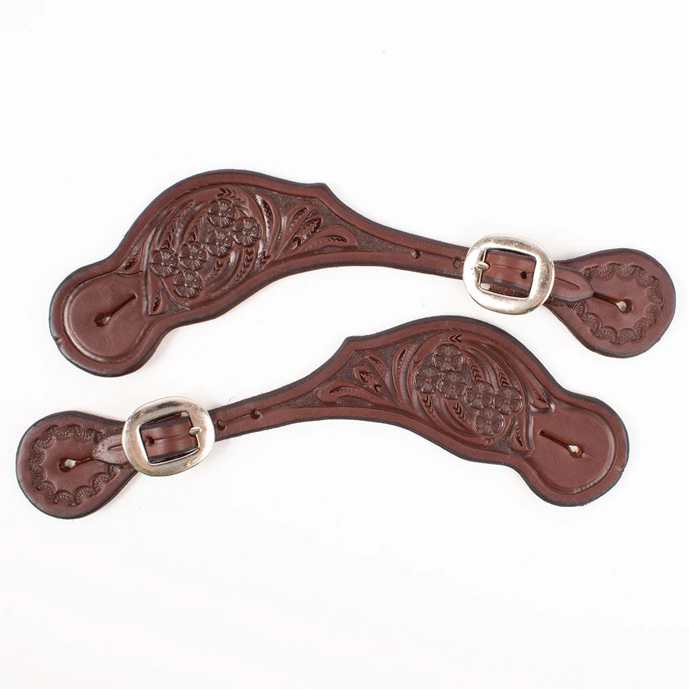 Mens floral tooled spur straps available in light oil and heavy oil.