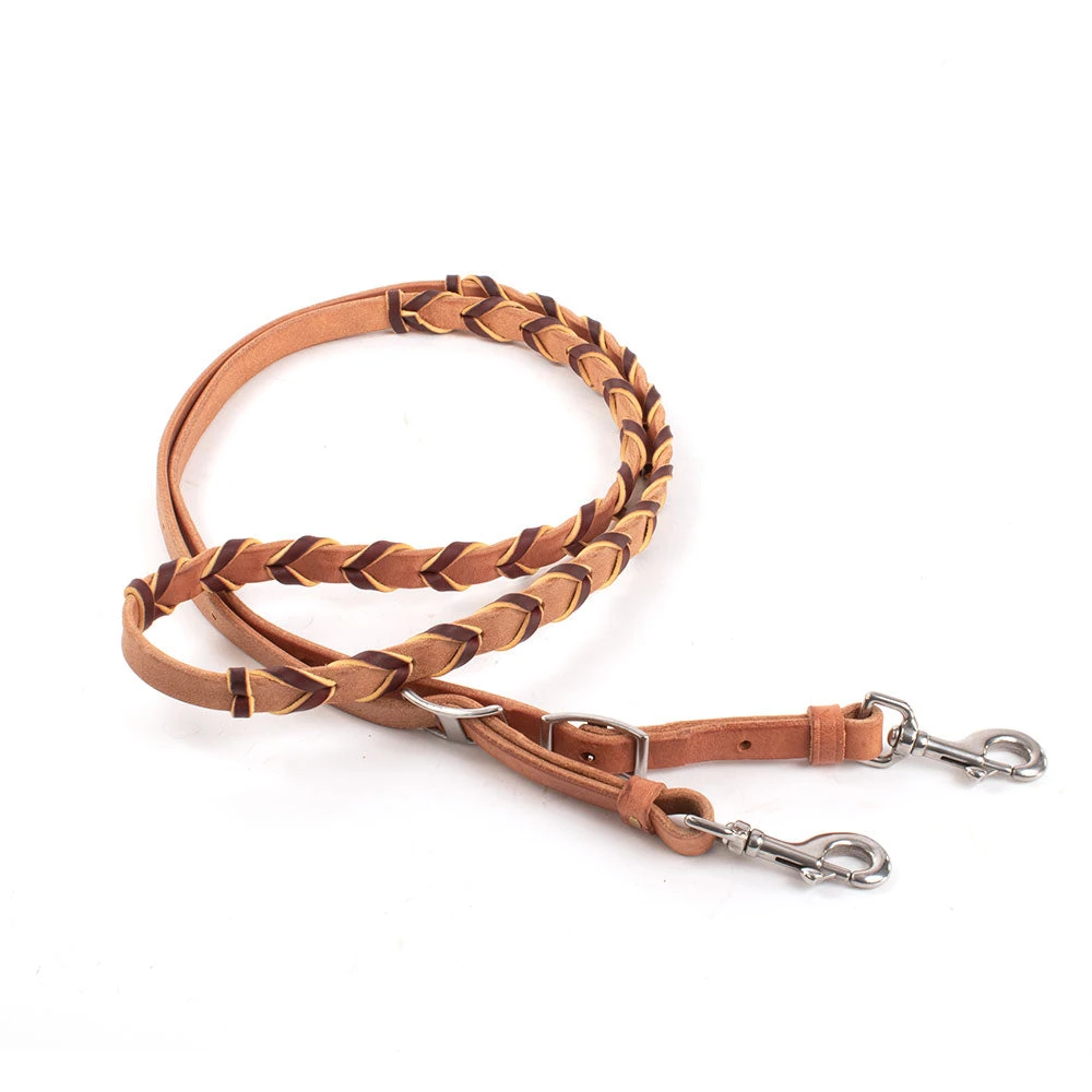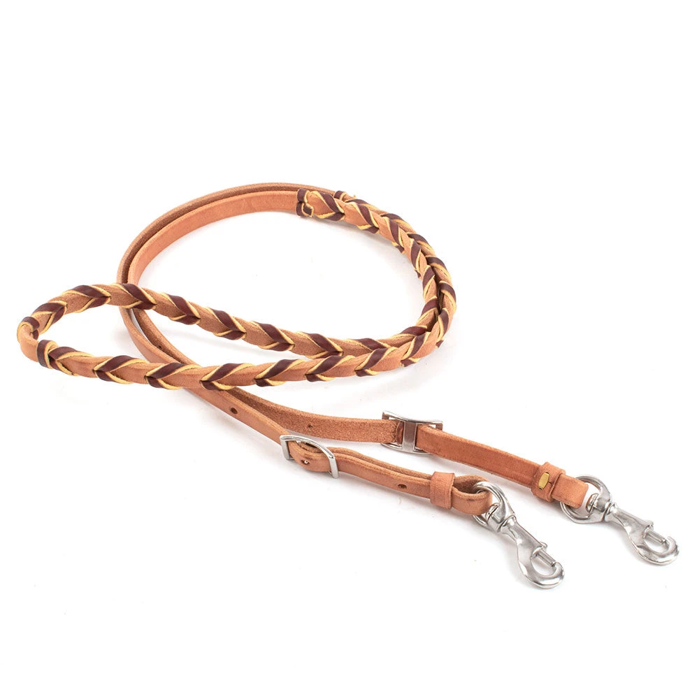 Herman Oak leather roping reins with latigo lacing, stainless steel hardware and snaps.