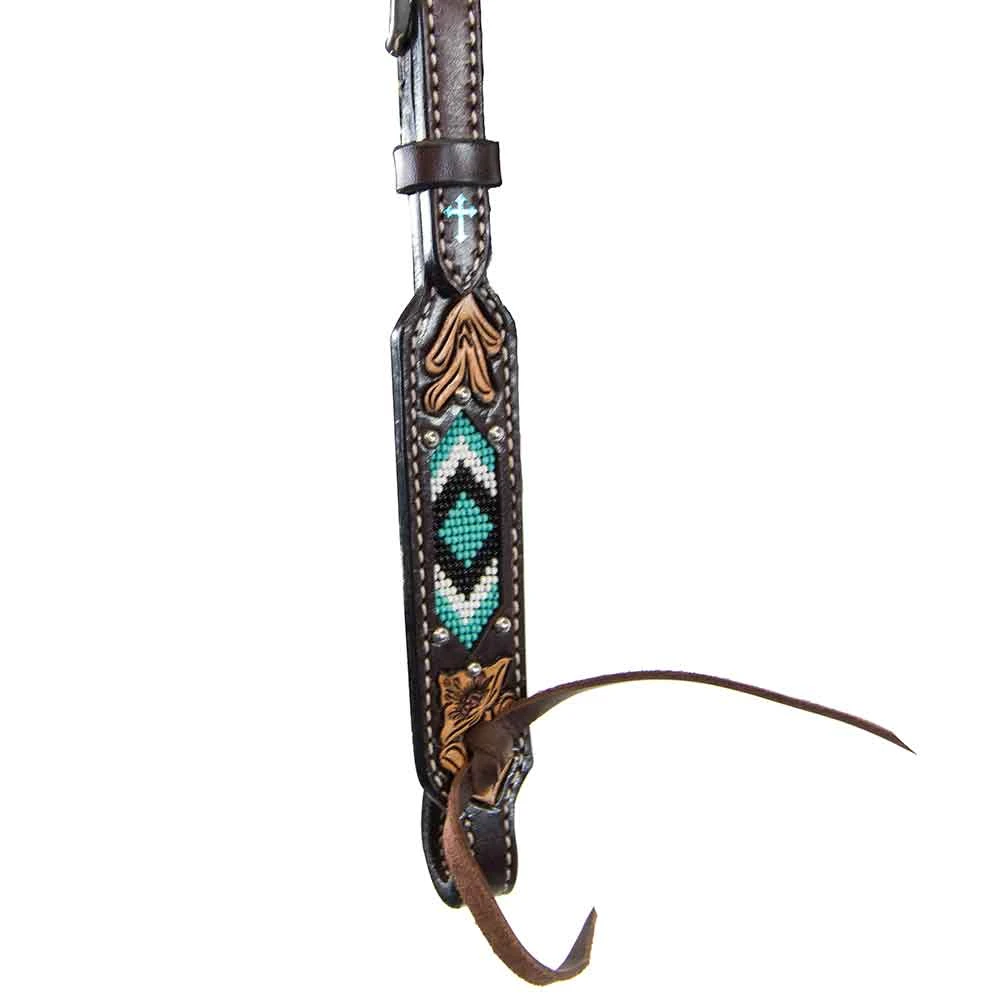 This headstall features dark oiled leather with carved floral accents highlighted with tan stain, turquoise diamond beaded inlays and stainless steel spots. Non-rust stainless steel hardware.